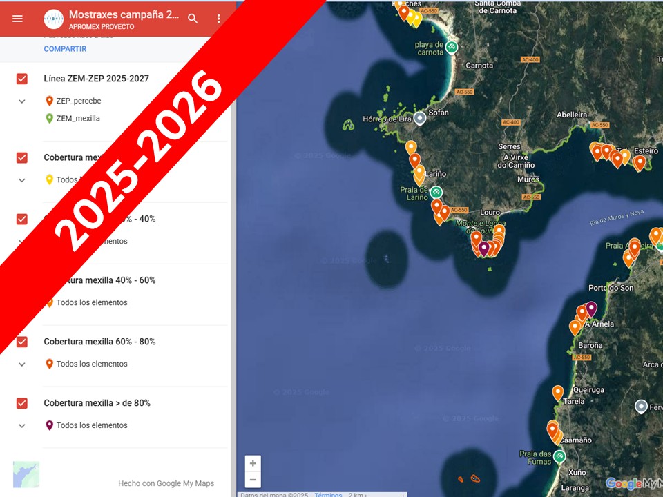 Resultados das mostraxes para a estimación da abundancia e da distribución de mexilla, previas á campaña de extracción de semente de mexillón 2025-2026.