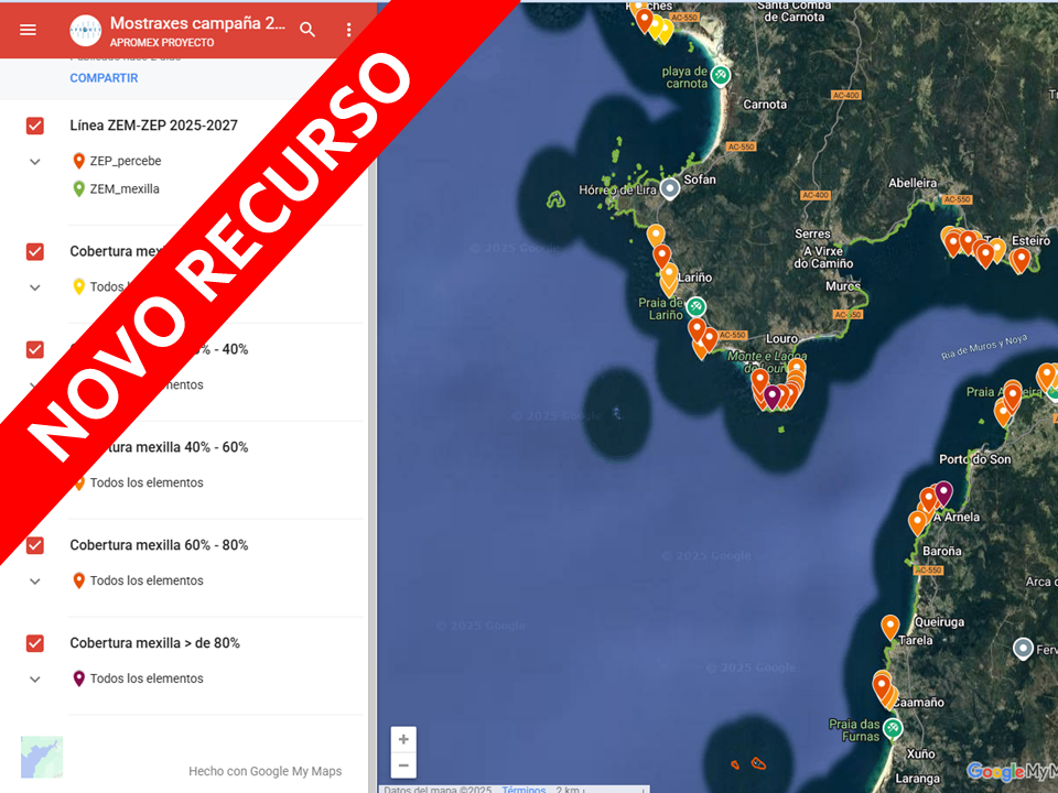 Resultados das mostraxes para a estimación da abundancia e da distribución de mexilla, previas á campaña de extracción de semente de mexillón 2025-2026.